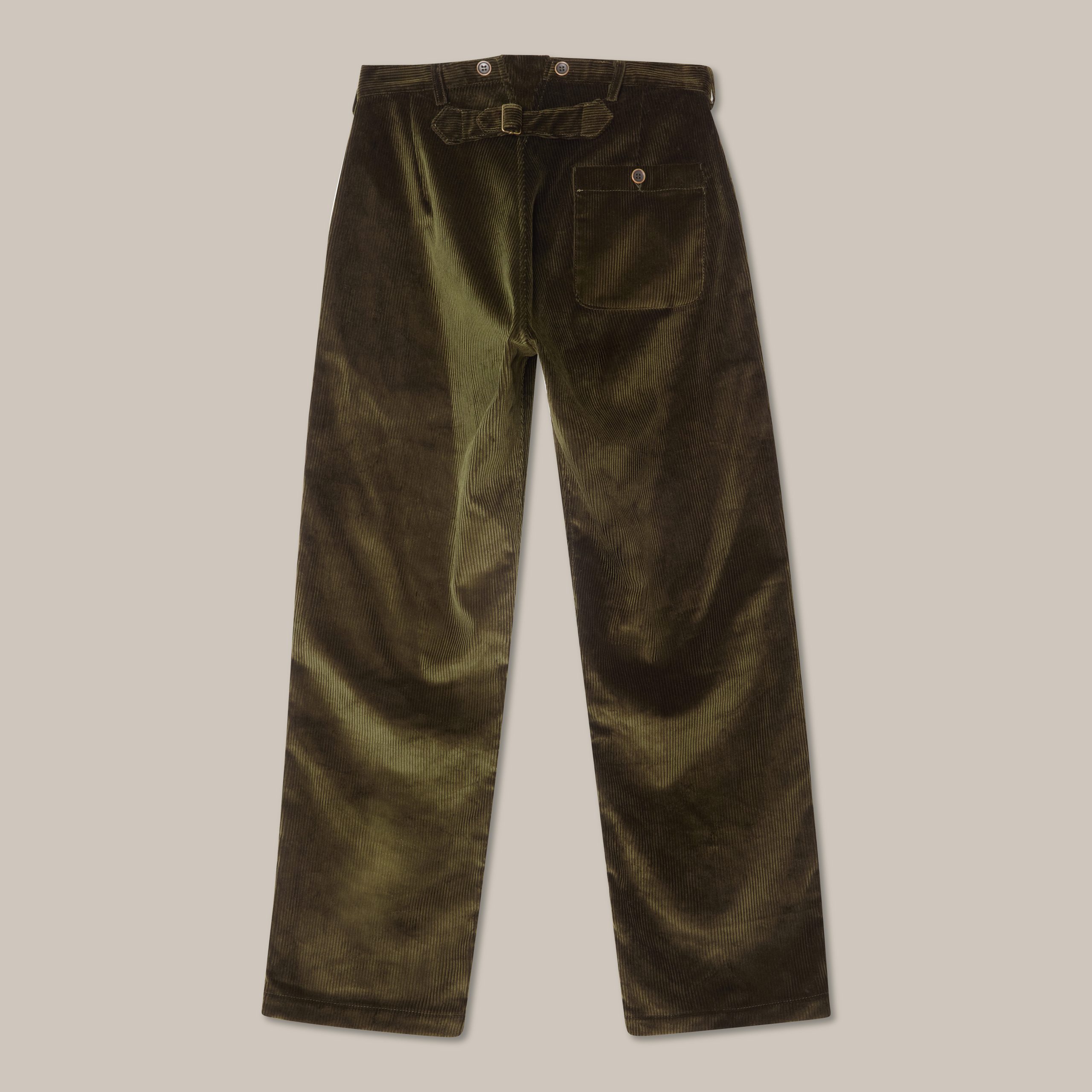 Inspired by vintage French workwear, the 1940 Cords channel an early 20th-century carpenter trouser, with its traditional high waist and relaxed silhouette. They are cut from a thick, olive-green corduroy with wide wales. It has an adjustable back martingale and both belt loops and suspender buttons for versatile wear.